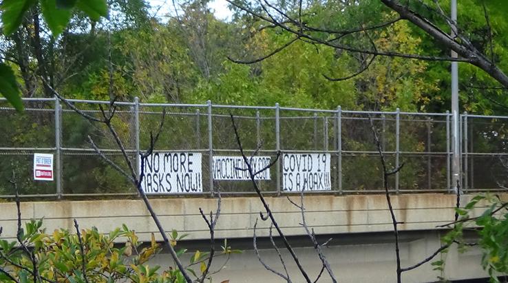 VACCINEHOAX.COM TEAM IN ACTION A FEW MILES EAST of OHARE INTERNATIONAL AIRPORT in CHICAGO, IL. BELOW these signs is the 6 lane KENNEDY EXPRESSWAY. 6000 cars an hour passed these signs. THANKYOU CHICAGO PD for upholding the 1st. Amendment.